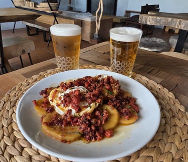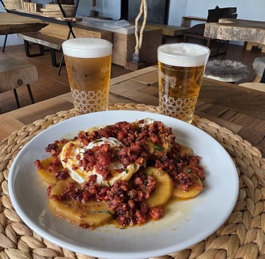 Huevos eco sobre suaves patatas confitadas, con picadillo de chorizo, la esencia rústica de la comida de siempre.
